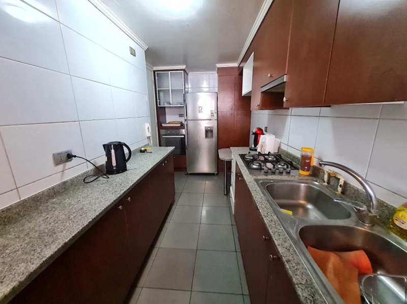 Cocina cerrada, tradicional equipada y amoblada, con buen mesón de granito, Cuenta con logia aparte.